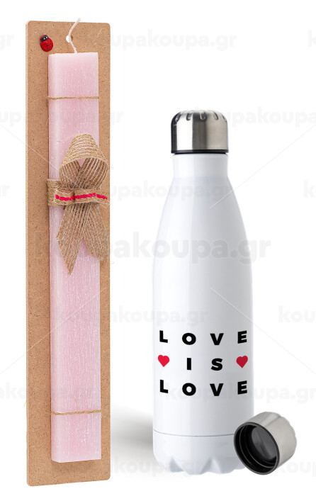 Love is Love, Πασχαλινή Λαμπάδα με μεταλλικό παγούρι ανοξείδωτο (750ml) & κερί αρωματικό πλακέ (30cm) (ΡΟΖ)