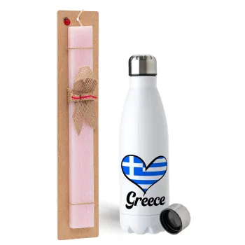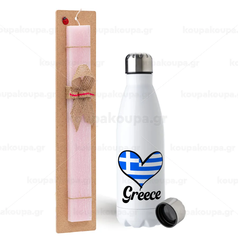 Greece flag, Πασχαλινή Λαμπάδα με μεταλλικό παγούρι ανοξείδωτο (750ml) & κερί αρωματικό πλακέ (30cm) (ΡΟΖ)