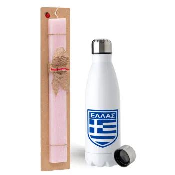 Ελλάς, Πασχαλινή Λαμπάδα με μεταλλικό παγούρι ανοξείδωτο (750ml) & κερί αρωματικό πλακέ (30cm) (ΡΟΖ)