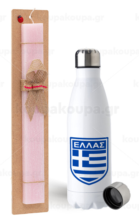 Ελλάς, Πασχαλινή Λαμπάδα με μεταλλικό παγούρι ανοξείδωτο (750ml) & κερί αρωματικό πλακέ (30cm) (ΡΟΖ)
