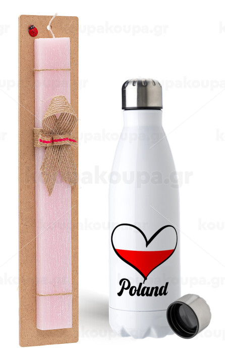 Poland flag, Πασχαλινή Λαμπάδα με μεταλλικό παγούρι ανοξείδωτο (750ml) & κερί αρωματικό πλακέ (30cm) (ΡΟΖ)