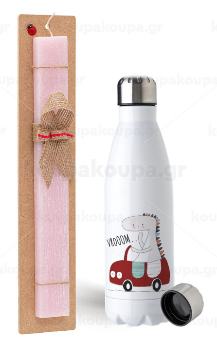 Βρουμ βρουμ, Πασχαλινή Λαμπάδα με μεταλλικό παγούρι ανοξείδωτο (750ml) & κερί αρωματικό πλακέ (30cm) (ΡΟΖ)