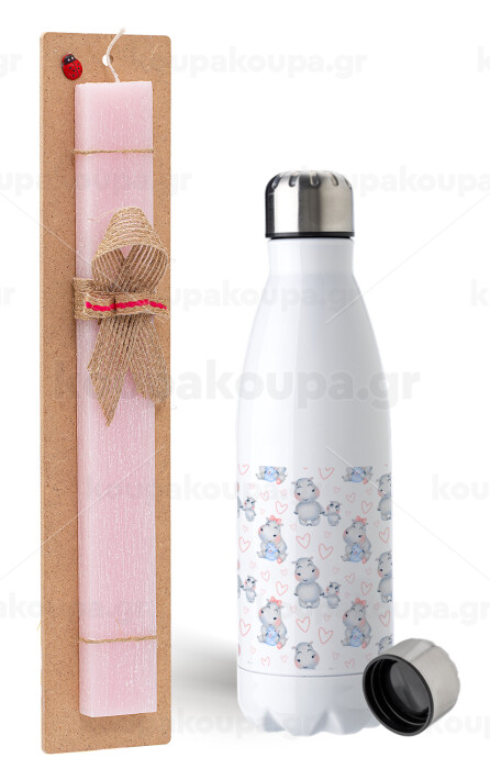 Ιπποπόταμος, Πασχαλινή Λαμπάδα με μεταλλικό παγούρι ανοξείδωτο (750ml) & κερί αρωματικό πλακέ (30cm) (ΡΟΖ)