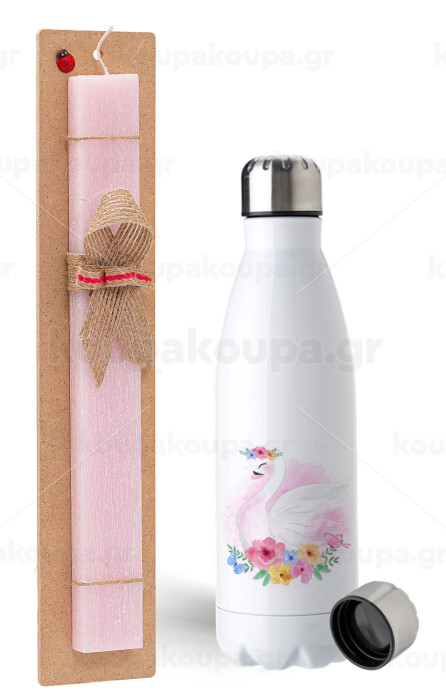 Λευκός κύκνος, Πασχαλινή Λαμπάδα με μεταλλικό παγούρι ανοξείδωτο (750ml) & κερί αρωματικό πλακέ (30cm) (ΡΟΖ)