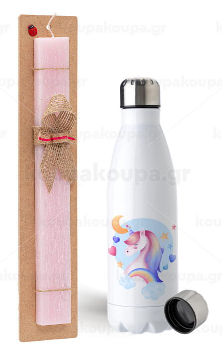 Μονόκερος, Πασχαλινή Λαμπάδα με μεταλλικό παγούρι ανοξείδωτο (750ml) & κερί αρωματικό πλακέ (30cm) (ΡΟΖ)