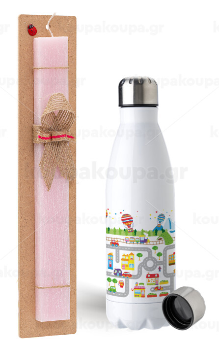 City road track maps, Πασχαλινή Λαμπάδα με μεταλλικό παγούρι ανοξείδωτο (750ml) & κερί αρωματικό πλακέ (30cm) (ΡΟΖ)