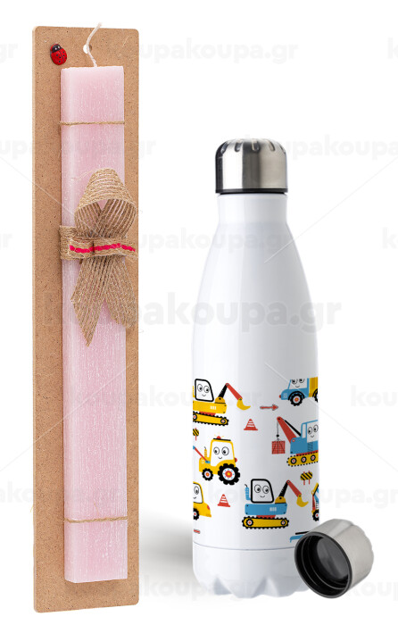 Hand drawing building truck, Πασχαλινή Λαμπάδα με μεταλλικό παγούρι ανοξείδωτο (750ml) & κερί αρωματικό πλακέ (30cm) (ΡΟΖ)