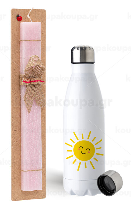 Happy sun, Πασχαλινή Λαμπάδα με μεταλλικό παγούρι ανοξείδωτο (750ml) & κερί αρωματικό πλακέ (30cm) (ΡΟΖ)