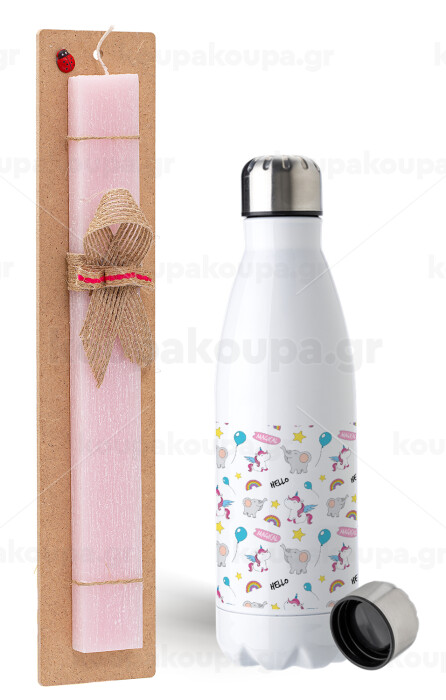 Happy Clouds Doodle, Πασχαλινή Λαμπάδα με μεταλλικό παγούρι ανοξείδωτο (750ml) & κερί αρωματικό πλακέ (30cm) (ΡΟΖ)