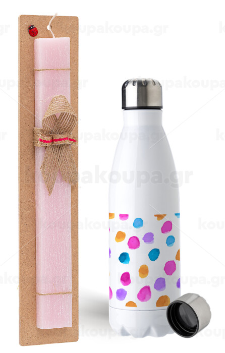 Watercolor dots, Πασχαλινή Λαμπάδα με μεταλλικό παγούρι ανοξείδωτο (750ml) & κερί αρωματικό πλακέ (30cm) (ΡΟΖ)