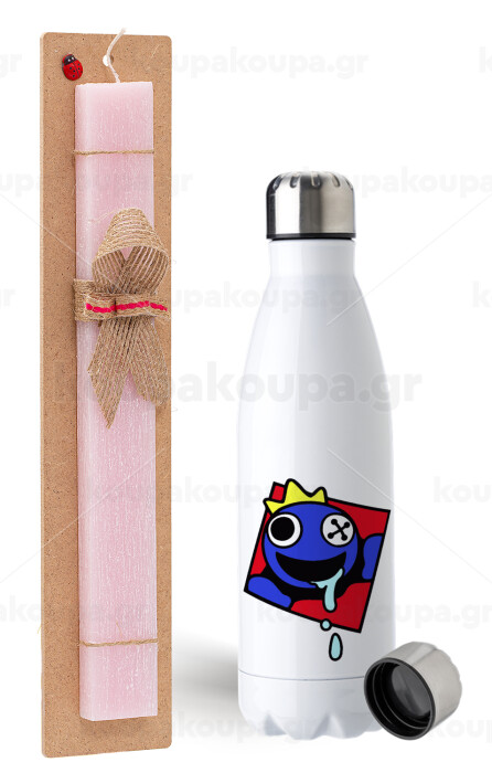 Blue, Rainbow friends, Πασχαλινή Λαμπάδα με μεταλλικό παγούρι ανοξείδωτο (750ml) & κερί αρωματικό πλακέ (30cm) (ΡΟΖ)