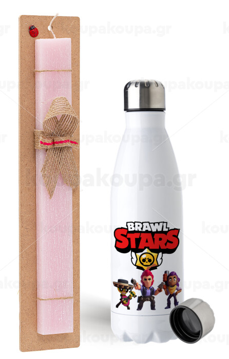 Brawl Stars Desert, Πασχαλινή Λαμπάδα με μεταλλικό παγούρι ανοξείδωτο (750ml) & κερί αρωματικό πλακέ (30cm) (ΡΟΖ)