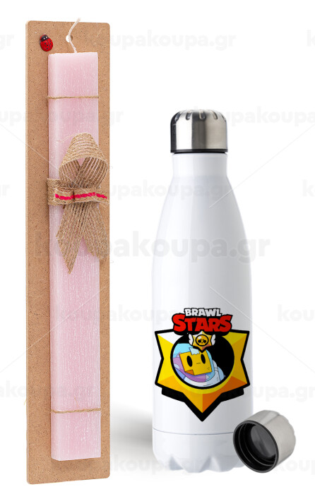 Brawl Stars Sprout, Πασχαλινή Λαμπάδα με μεταλλικό παγούρι ανοξείδωτο (750ml) & κερί αρωματικό πλακέ (30cm) (ΡΟΖ)