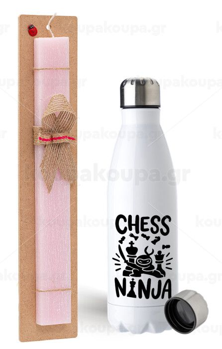 Chess ninja, Πασχαλινή Λαμπάδα με μεταλλικό παγούρι ανοξείδωτο (750ml) & κερί αρωματικό πλακέ (30cm) (ΡΟΖ)