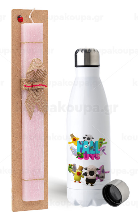 FALL GUYS, Πασχαλινή Λαμπάδα με μεταλλικό παγούρι ανοξείδωτο (750ml) & κερί αρωματικό πλακέ (30cm) (ΡΟΖ)