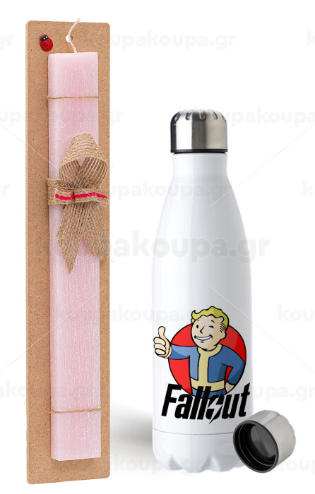 Fallout Vault Boy, Πασχαλινή Λαμπάδα με μεταλλικό παγούρι ανοξείδωτο (750ml) & κερί αρωματικό πλακέ (30cm) (ΡΟΖ)