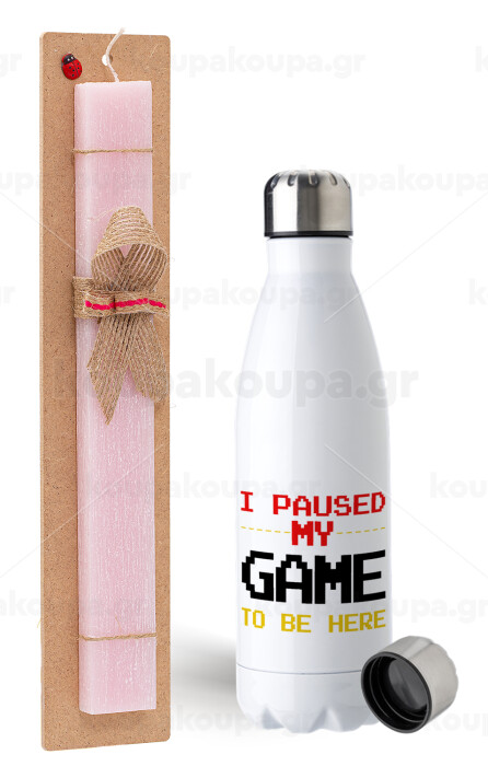 I paused my game to be here, Πασχαλινή Λαμπάδα με μεταλλικό παγούρι ανοξείδωτο (750ml) & κερί αρωματικό πλακέ (30cm) (ΡΟΖ)