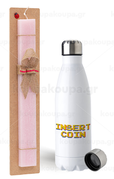 Insert coin!!!, Πασχαλινή Λαμπάδα με μεταλλικό παγούρι ανοξείδωτο (750ml) & κερί αρωματικό πλακέ (30cm) (ΡΟΖ)