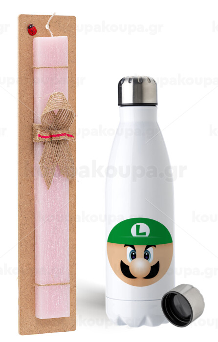 Luigi flat, Πασχαλινή Λαμπάδα με μεταλλικό παγούρι ανοξείδωτο (750ml) & κερί αρωματικό πλακέ (30cm) (ΡΟΖ)