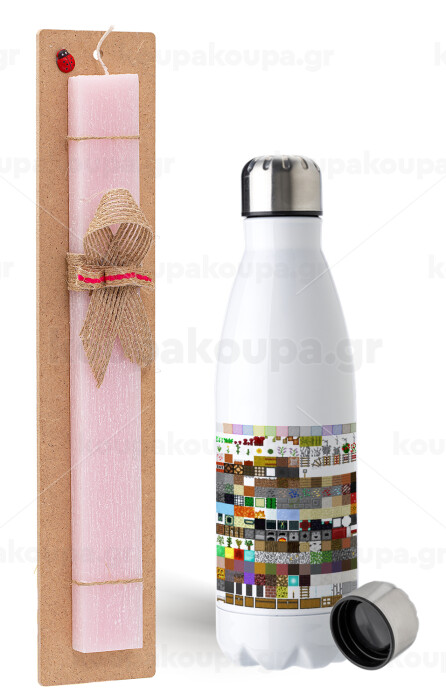 Minecraft blocks, Πασχαλινή Λαμπάδα με μεταλλικό παγούρι ανοξείδωτο (750ml) & κερί αρωματικό πλακέ (30cm) (ΡΟΖ)