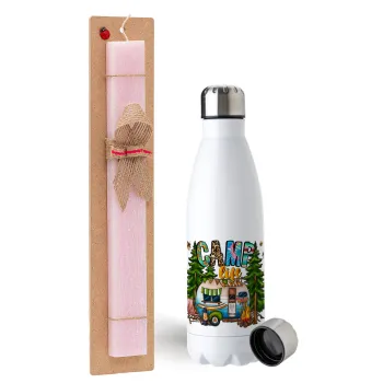 Camp Life, Πασχαλινή Λαμπάδα με μεταλλικό παγούρι ανοξείδωτο (750ml) & κερί αρωματικό πλακέ (30cm) (ΡΟΖ)