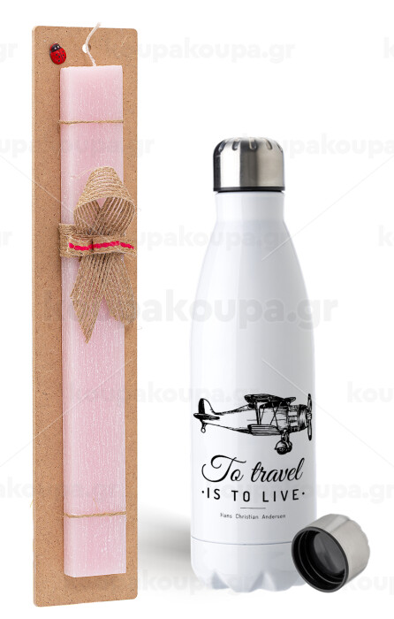 To travel is to live, Πασχαλινή Λαμπάδα με μεταλλικό παγούρι ανοξείδωτο (750ml) & κερί αρωματικό πλακέ (30cm) (ΡΟΖ)