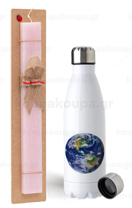 Planet Earth, Πασχαλινή Λαμπάδα με μεταλλικό παγούρι ανοξείδωτο (750ml) & κερί αρωματικό πλακέ (30cm) (ΡΟΖ)