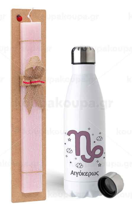 Ζώδια Αιγόκερως, Πασχαλινή Λαμπάδα με μεταλλικό παγούρι ανοξείδωτο (750ml) & κερί αρωματικό πλακέ (30cm) (ΡΟΖ)