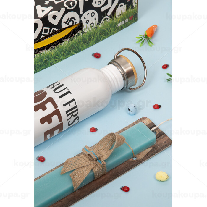 But first Coffee, Πασχαλινή Λαμπάδα με παγούρι μεταλλικό (620ml, stainless steel) & κερί αρωματικό πλακέ (30cm) (ΤΙΡΚΟΥΑΖ)