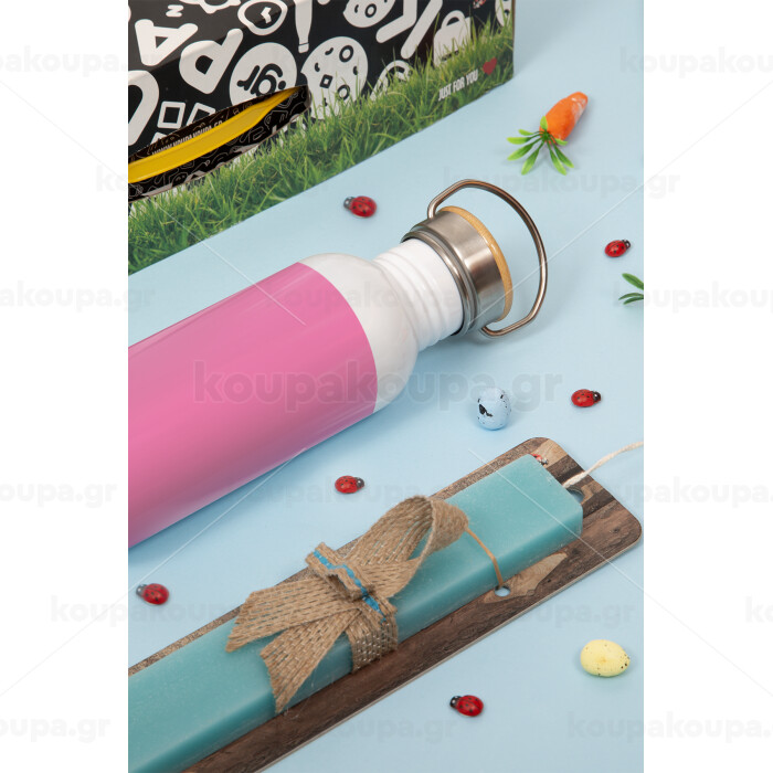 PANTONE Pink C, Πασχαλινή Λαμπάδα με παγούρι μεταλλικό (620ml, stainless steel) & κερί αρωματικό πλακέ (30cm) (ΤΙΡΚΟΥΑΖ)