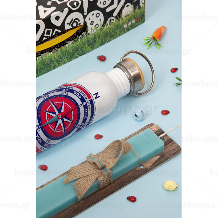 Ανεμολόγιο χάρτης πυξίδα ναυτικού, Πασχαλινή Λαμπάδα με παγούρι μεταλλικό (620ml, stainless steel) & κερί αρωματικό πλακέ (30cm) (ΤΙΡΚΟΥΑΖ)