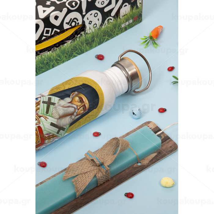 Άγιος Νεκτάριος, Πασχαλινή Λαμπάδα με παγούρι μεταλλικό (620ml, stainless steel) & κερί αρωματικό πλακέ (30cm) (ΤΙΡΚΟΥΑΖ)