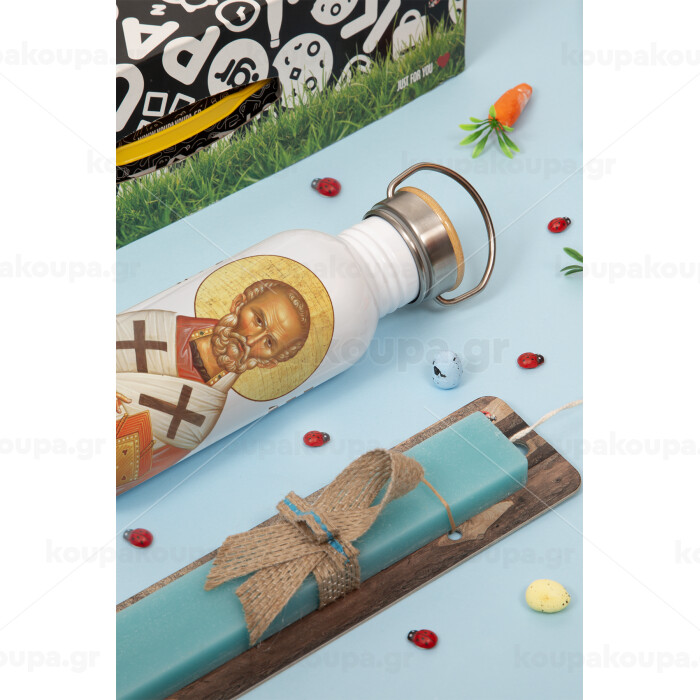 Άγιος Νικόλαος, Πασχαλινή Λαμπάδα με παγούρι μεταλλικό (620ml, stainless steel) & κερί αρωματικό πλακέ (30cm) (ΤΙΡΚΟΥΑΖ)
