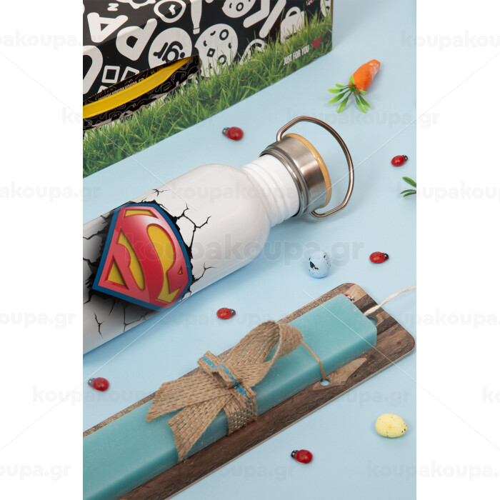 Superman cracked, Πασχαλινή Λαμπάδα με παγούρι μεταλλικό (620ml, stainless steel) & κερί αρωματικό πλακέ (30cm) (ΤΙΡΚΟΥΑΖ)