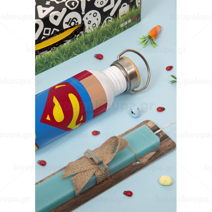 Superman flat, Πασχαλινή Λαμπάδα με παγούρι μεταλλικό (620ml, stainless steel) & κερί αρωματικό πλακέ (30cm) (ΤΙΡΚΟΥΑΖ)