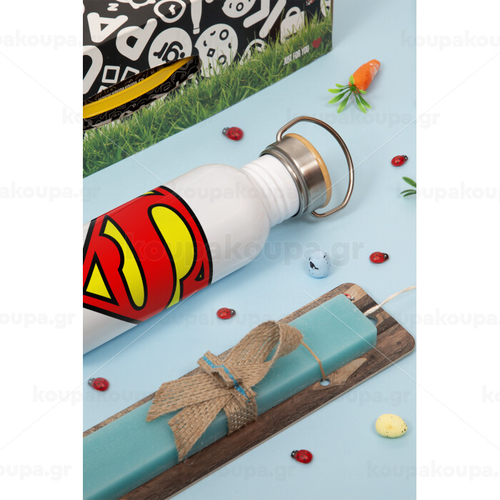 Superman vintage, Πασχαλινή Λαμπάδα με παγούρι μεταλλικό (620ml, stainless steel) & κερί αρωματικό πλακέ (30cm) (ΤΙΡΚΟΥΑΖ)