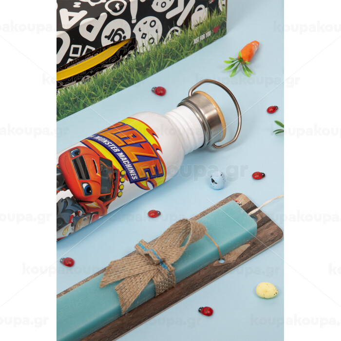 Ο Μπλέιζ και οι Φίλοι του, Πασχαλινή Λαμπάδα με παγούρι μεταλλικό (620ml, stainless steel) & κερί αρωματικό πλακέ (30cm) (ΤΙΡΚΟΥΑΖ)
