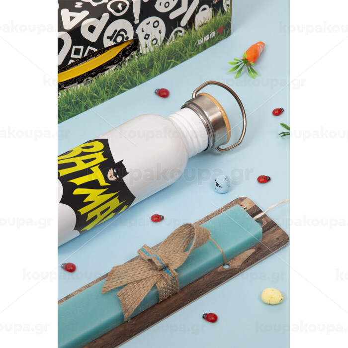 Batman classic logo, Πασχαλινή Λαμπάδα με παγούρι μεταλλικό (620ml, stainless steel) & κερί αρωματικό πλακέ (30cm) (ΤΙΡΚΟΥΑΖ)