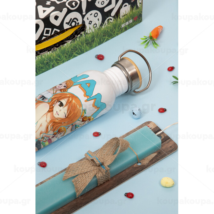 Nami One Piece, Πασχαλινή Λαμπάδα με παγούρι μεταλλικό (620ml, stainless steel) & κερί αρωματικό πλακέ (30cm) (ΤΙΡΚΟΥΑΖ)