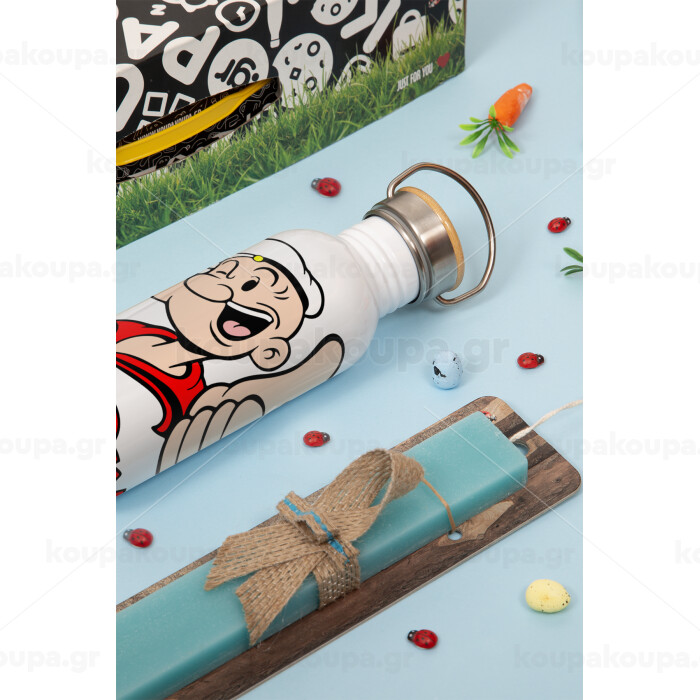 Popeye the sailor man, Πασχαλινή Λαμπάδα με παγούρι μεταλλικό (620ml, stainless steel) & κερί αρωματικό πλακέ (30cm) (ΤΙΡΚΟΥΑΖ)