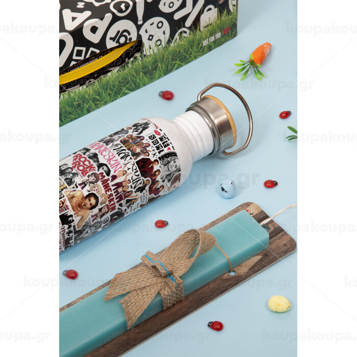 Maneskin stickers, Πασχαλινή Λαμπάδα με παγούρι μεταλλικό (620ml, stainless steel) & κερί αρωματικό πλακέ (30cm) (ΤΙΡΚΟΥΑΖ)
