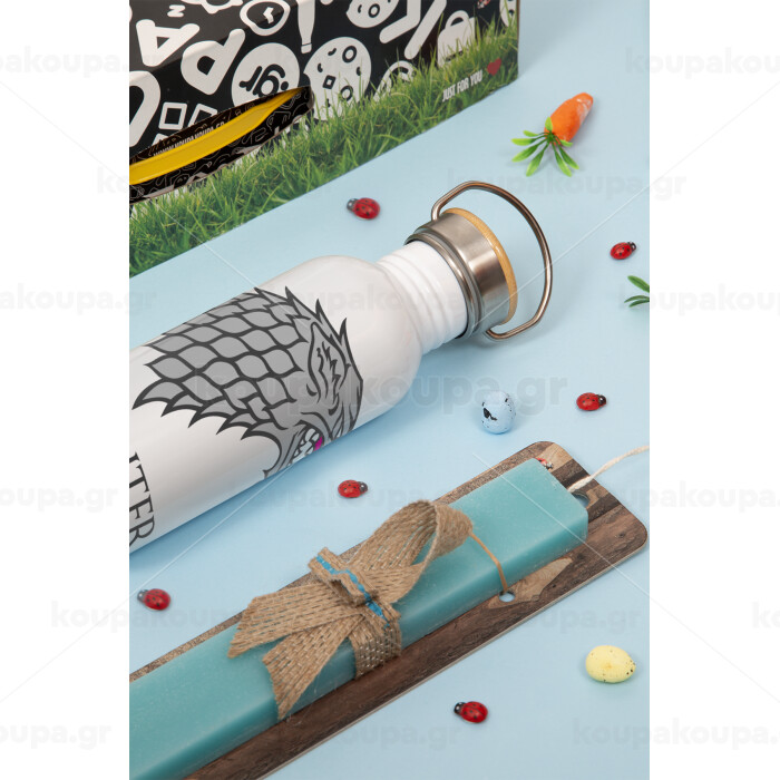 GOT House of Starks, winter coming, Πασχαλινή Λαμπάδα με παγούρι μεταλλικό (620ml, stainless steel) & κερί αρωματικό πλακέ (30cm) (ΤΙΡΚΟΥΑΖ)