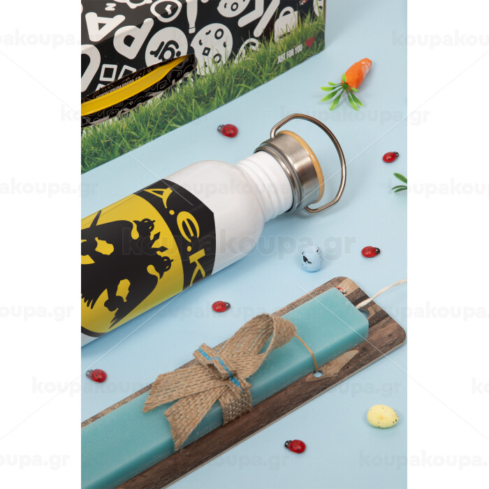 ΑΕΚ, Πασχαλινή Λαμπάδα με παγούρι μεταλλικό (620ml, stainless steel) & κερί αρωματικό πλακέ (30cm) (ΤΙΡΚΟΥΑΖ)