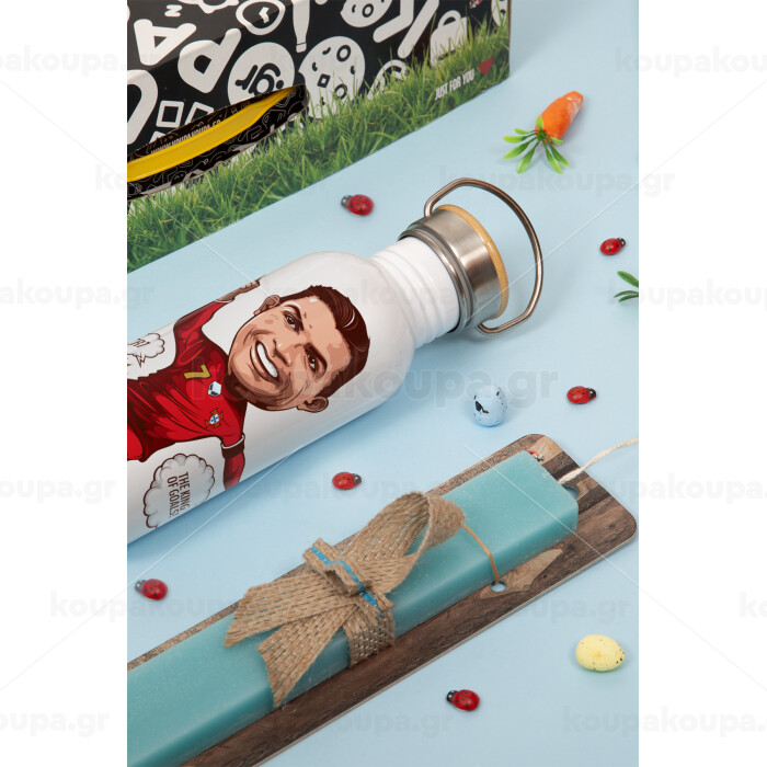 Cristiano Ronaldo, Πασχαλινή Λαμπάδα με παγούρι μεταλλικό (620ml, stainless steel) & κερί αρωματικό πλακέ (30cm) (ΤΙΡΚΟΥΑΖ)