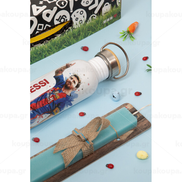 Λιονέλ Μέσι, Πασχαλινή Λαμπάδα με παγούρι μεταλλικό (620ml, stainless steel) & κερί αρωματικό πλακέ (30cm) (ΤΙΡΚΟΥΑΖ)