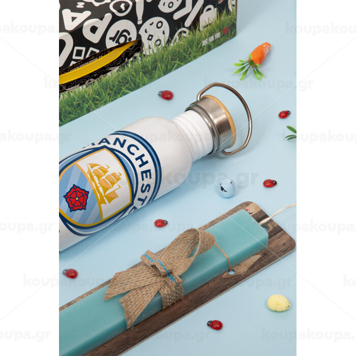 Manchester City FC , Πασχαλινή Λαμπάδα με παγούρι μεταλλικό (620ml, stainless steel) & κερί αρωματικό πλακέ (30cm) (ΤΙΡΚΟΥΑΖ)