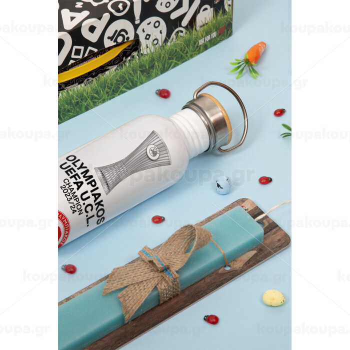 Ολυμπιακός νικητής UEFA Europa Conference League Champion 2023/24, Πασχαλινή Λαμπάδα με παγούρι μεταλλικό (620ml, stainless steel) & κερί αρωματικό πλακέ (30cm) (ΤΙΡΚΟΥΑΖ)