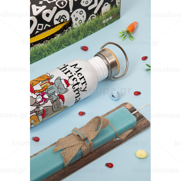 Merry Christmas Cats, Πασχαλινή Λαμπάδα με παγούρι μεταλλικό (620ml, stainless steel) & κερί αρωματικό πλακέ (30cm) (ΤΙΡΚΟΥΑΖ)