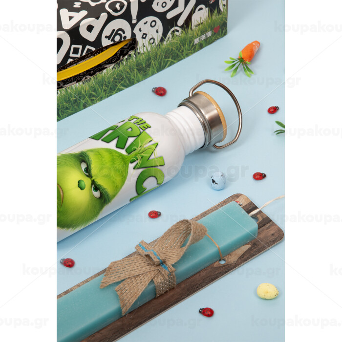 mr grinch, Πασχαλινή Λαμπάδα με παγούρι μεταλλικό (620ml, stainless steel) & κερί αρωματικό πλακέ (30cm) (ΤΙΡΚΟΥΑΖ)