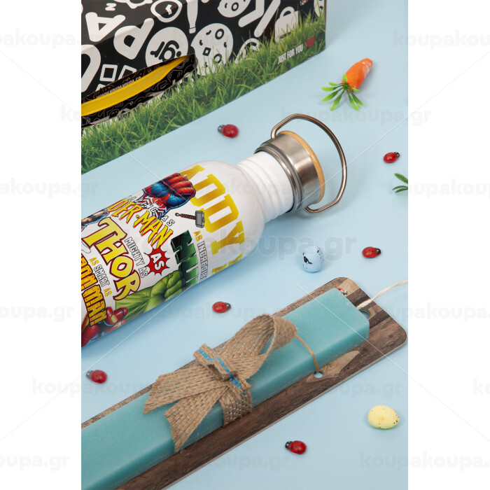 Daddy You Are my Hero, Πασχαλινή Λαμπάδα με παγούρι μεταλλικό (620ml, stainless steel) & κερί αρωματικό πλακέ (30cm) (ΤΙΡΚΟΥΑΖ)
